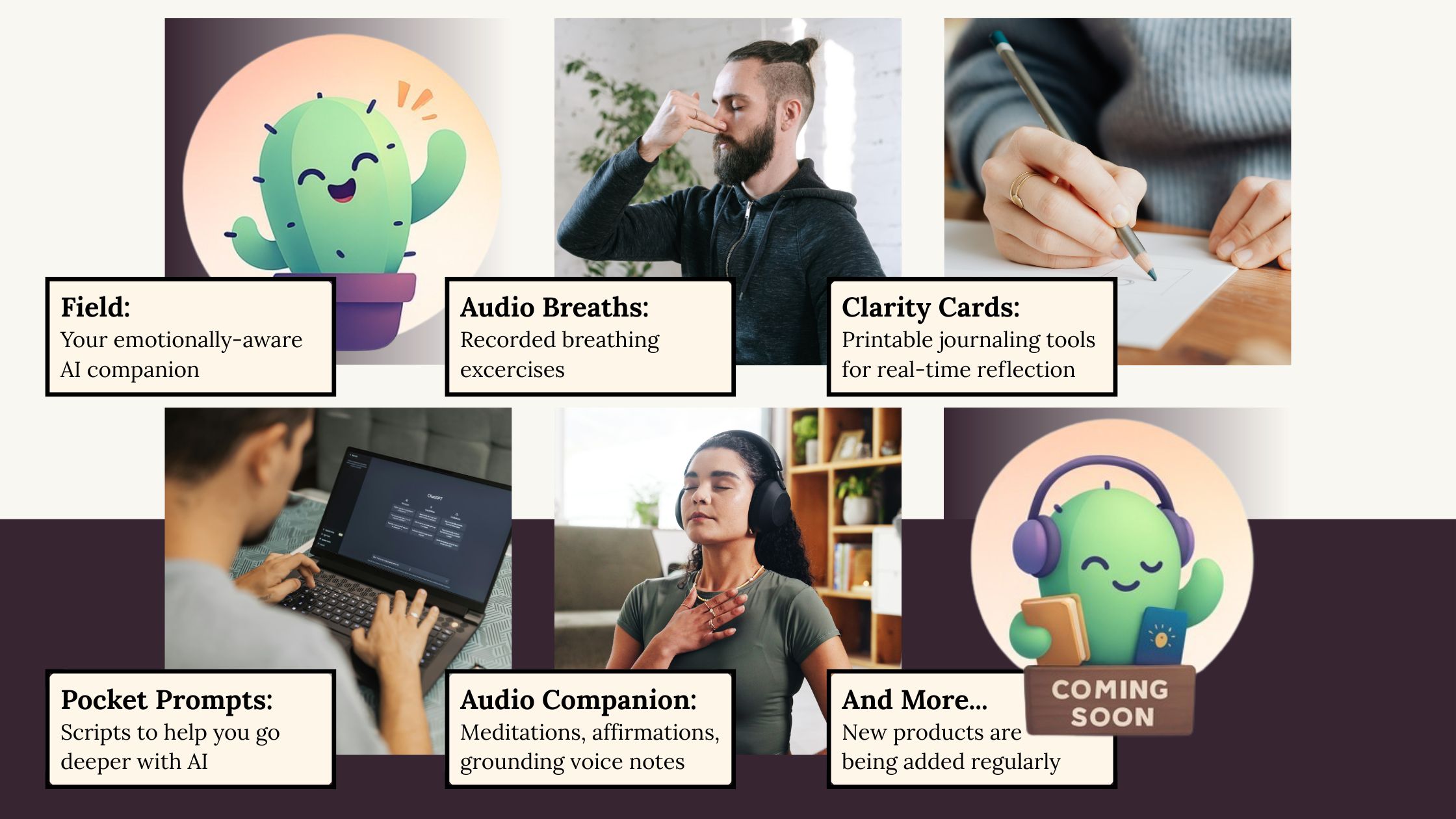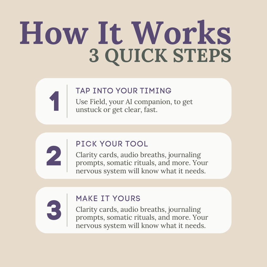 Field listens like your favourite late-night friend, reflects like a mirror that actually sees you, and drops rituals that shift your nervous system in 60 seconds.